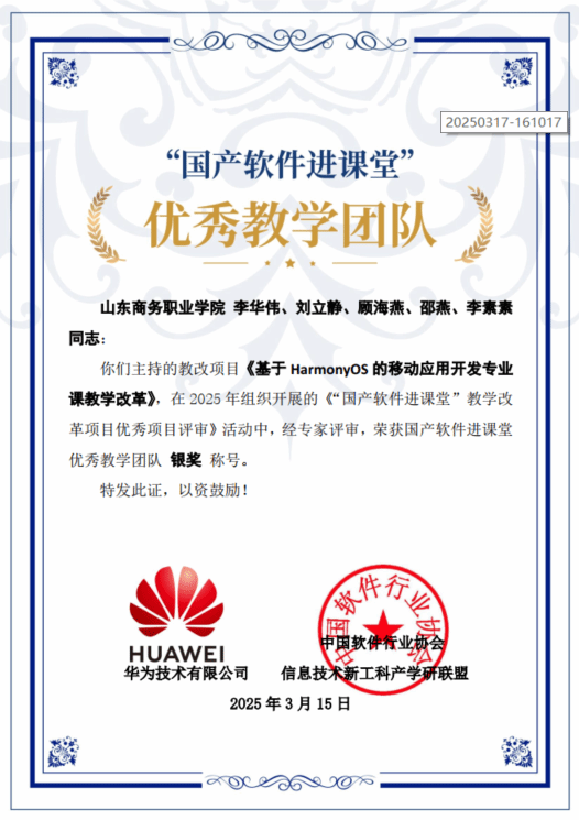 Our Institute Wins Silver Award for Outstanding Teaching Team in "Domestic Software in the Classroom" Initiative.... COLUMN:[News] DATE:2025-03-19 In the 2025 "Domestic Software in the Classroom" Teaching Reform Project Excellence Awards, organized by Huawei Technologies Co., Ltd. and the China Software Industry Association, the Software Technology Teaching Team from the School of Information Engineering at our university was honored with the Silver Award for Outstanding Teaching Team. This recognition highlights their exceptional performance ... ...