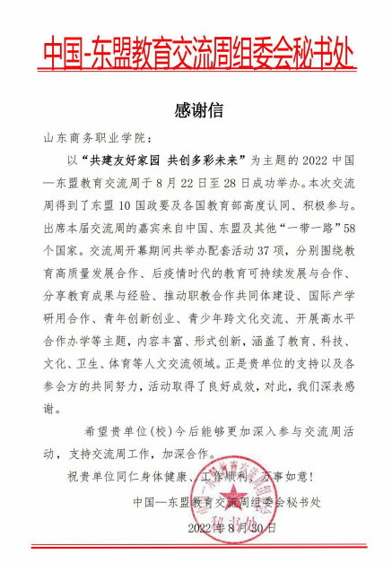The Secretariat of China-ASEAN Education Exchange Week Organizing Committee sent a letter of appreciation to praise the work of our school.... COLUMN:[News] DATE:2022-09-22 The 2022 China-ASEAN Education Exchange Week was successfully held from August 2 to 28. Recently, the secretariat of the China-ASEAN Education Exchange Week Organizing Committee sent a letter of appreciation to our school for our contribution to this year's exchange week. During the exchange week, the China-ASEAN International Symposium on Food Security and Vocational Talent Personnel host... ...