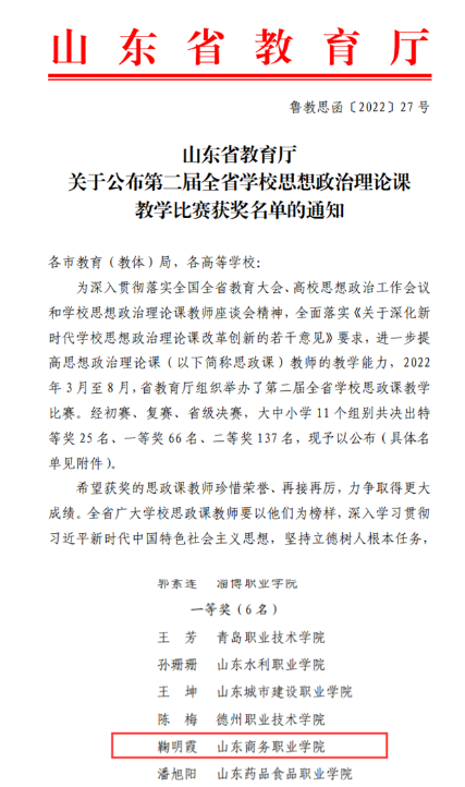 Our Teacher Won the First Prize in Shandong Province Civic Theory Teaching Competition.... COLUMN:[News] DATE:2022-09-13 Recently, Shandong Provincial Department of Education announced the winners list of the 2nd Shandong Provincial Ideological and Political Theory Class Teaching Competition, and the teacher Ms. Ju Mingxia from the Department of Ideological and Political Theory Teaching won the first prize in the Higher Vocational Group. This teaching competition effectively promoted the learning and communicat... ...