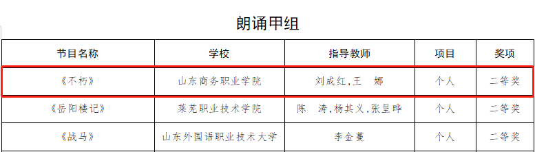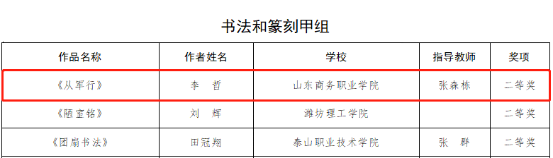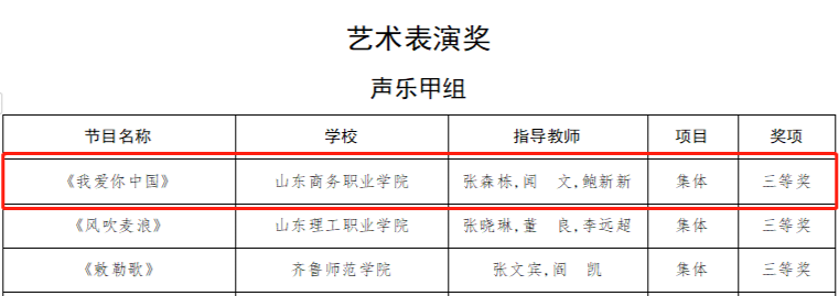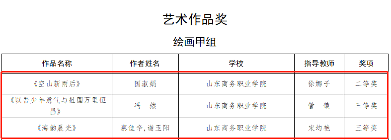 Recently, the list of winners for the 7th Shandong Provincial College Student Art Exhibition was announced. Our school's works won 1 first prize in the Art Practice Workshop, 1 first prize in the Excellent Case of Reform and Innovation in Aesthetic Education in Colleges and Universities, 2 third prizes and 3 second prizes in art works, 1 third prize and 2 second prizes in art performances.