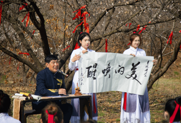 To promote traditional culture and awaken the power of aesthetics, in response to the Yantai Municipal Government’s Three-Year Action Plan for the Public Aesthetic Education Project, the "Lectures at the Apricot Altar" event was held in the apricot grove of Dashanhou Village, Jiejiazhuang Sub-district, Laishan District on the morning of April 3rd. Co-sponsored by Shandong Business Vocational College, the Publicity Department of Laishan District Committee of the CPC, and Yantai Cultural Center, and jointly organized by Jiejiazhuang Sub-district Office, Jizhi Aesthetics (Yantai) Cultural Development Co., Ltd., and Yantai Shanhaiqing Cultural Tourism and Health & Wellness Co., Ltd., the event was themed "Lectures at the Apricot Altar, Awakening the Power of Aesthetics." Through a combination of aesthetic education lectures and traditional cultural experiences, it enabled young students to feel the charm of excellent traditional Chinese culture amidst the blooming apricot blossoms in spring, enhancing their aesthetic literacy and cultural confidence.