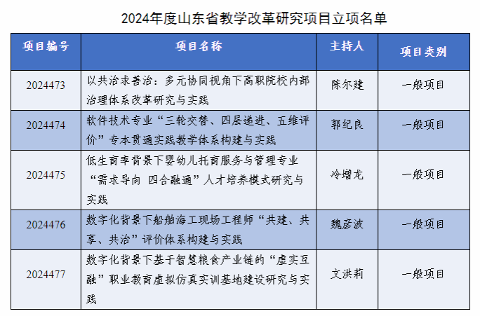 Recently, the Shandong Provincial Department of Education issued the "Notice on the Approval of 2024 Shandong Vocational Education Teaching Reform Research Projects" (LuJiaoZhiHan [2025] No. 6), in which five teaching reform research projects from our university were successfully approved. This achievement highlights our university’s significant progress in vocational education innovation and reflects our active efforts to enhance teaching quality and advance educational modernization.