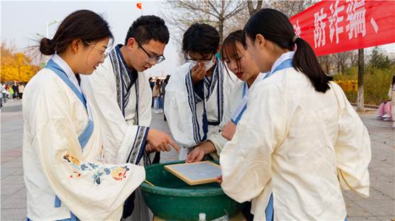 There are more than 50 stalls in this traditional culture exhibition, including Paper-Cut, Facial makeup, Jiaodong Huabobo, Papermaking, Shandong Embroidery, Calligraphy, Tai Chi, Tie Dyeing, Printing, Shaolin Kung Fu, Tea Art, Han Chinese Clothing and so on. Shandong Embroidery is one of “eight famous emnroideries” in China. Our school has built a Shandong Embroidery Inheritance Base of Chinese Traditional Culture. Yantai Paper Cutting is famous at home and abroad. Our school has built Mrs. Zhu Manhua Paper Cutting Inheritance Base and Mrs. Han Yuehu Paper Cutting Studio.