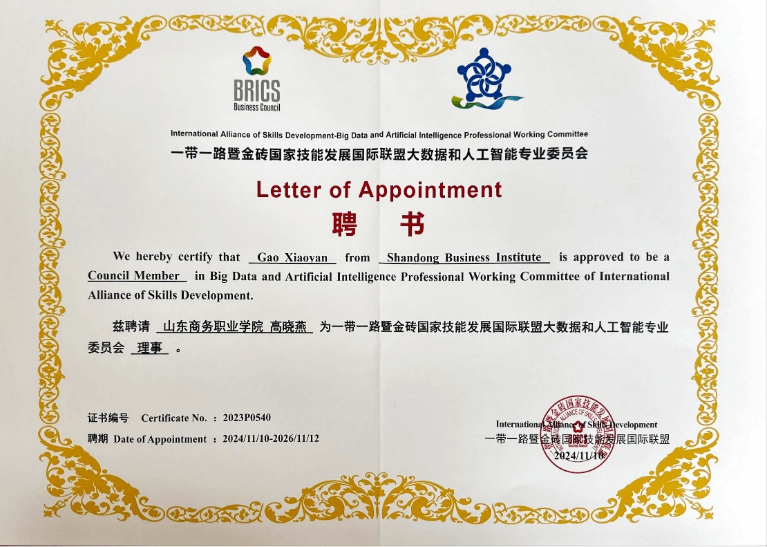 Recently, our school has been successfully elected as the Deputy Director Unit of the Big Data and Artificial Intelligence Professional Committee under the Belt and Road and BRICS Skills Development International Alliance. Gao Xiaoyan, Dean of the School of Information Engineering, has been elected as a council member of the committee. This achievement marks a significant breakthrough for our school in the professional development and international collaboration in the fields of big data and artificial intelligence.